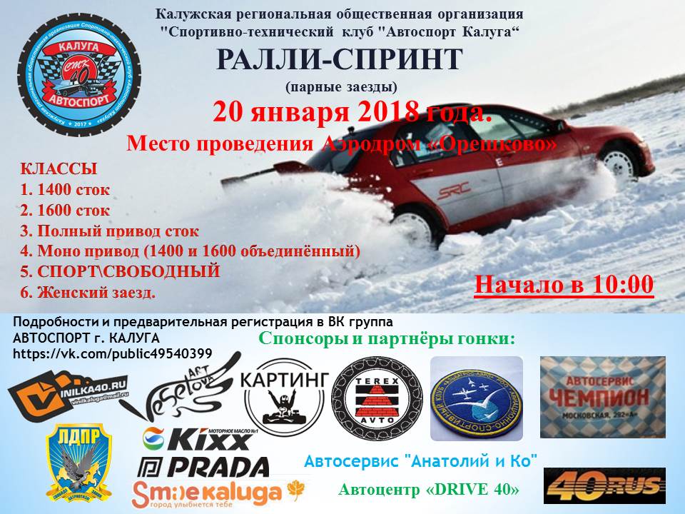 Друзья!!! Уже в эту субботу,27 января мы готовы провести свой однодневный чемпионат,приуроченный к празднованию дня студента,он же Татьянин день!!! Зачеты в 6ти классах; -передний спорт -передний стандарт -задний спорт -задний стандарт -полный спорт -полный стандарт Регламент будет опубликован к вечеру 23.01.2018 Стартовый взнос; Предварительно подавшим заявку и оплатив — 1000₽ На месте в день проведения — 1500₽ Телеметрия будет организованна командой RaceRussia. Более подробная информация появится завтра,после контрольной подготовки трассы!!! Коллектив Ралли Спринт Жуковский при поддержки внедорожного клуба Zhuk 4×4! https://vk.com/rallyzhuk